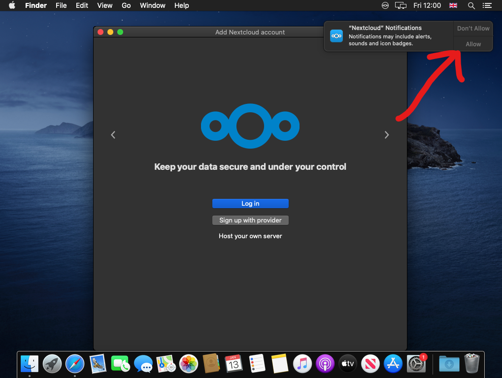 Nextcloud should now open, a pop up in the corner should ask for permission for notifications, click allow