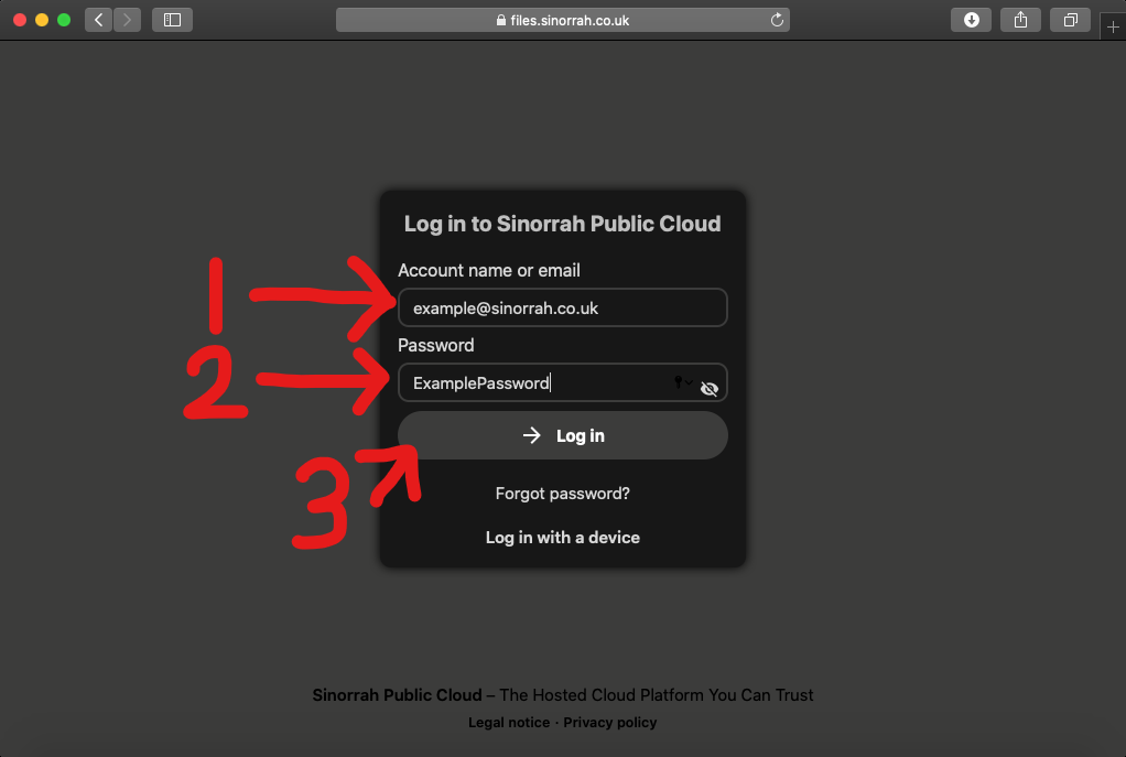 You should now be greeted with a login page, please put your email in the "Account name or Email" box, then put your password in the "Password" box, then click "Log in"