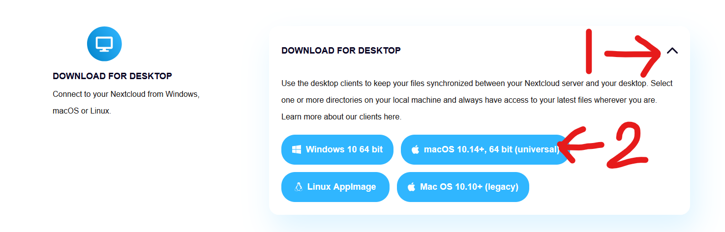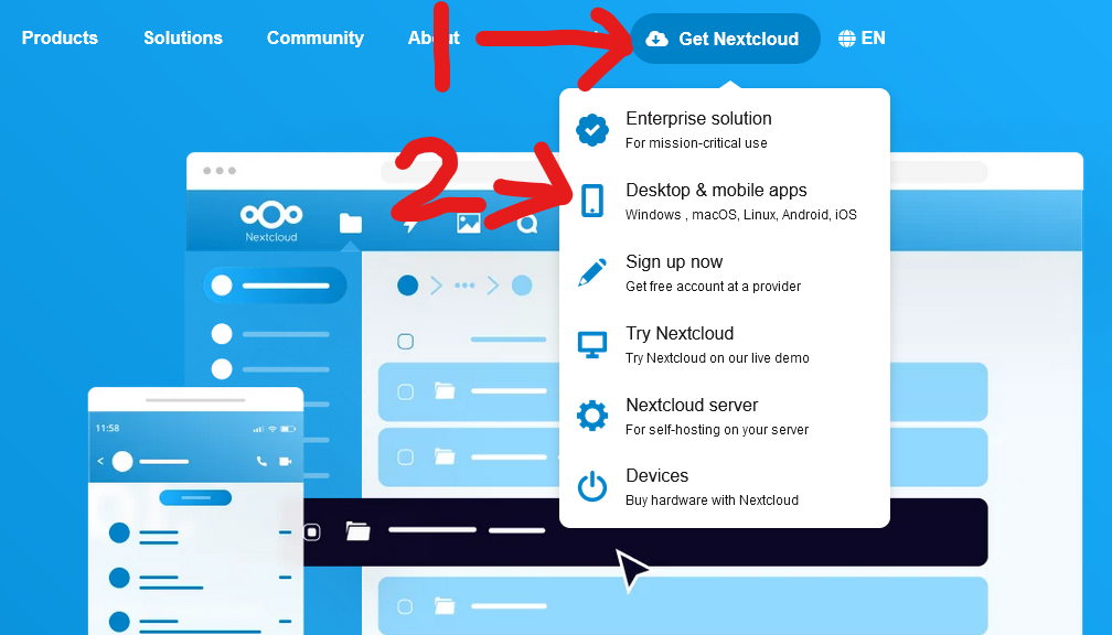 Along the top of the page go to "Get Nextcloud", then click "Desktop & Mobile Apps"