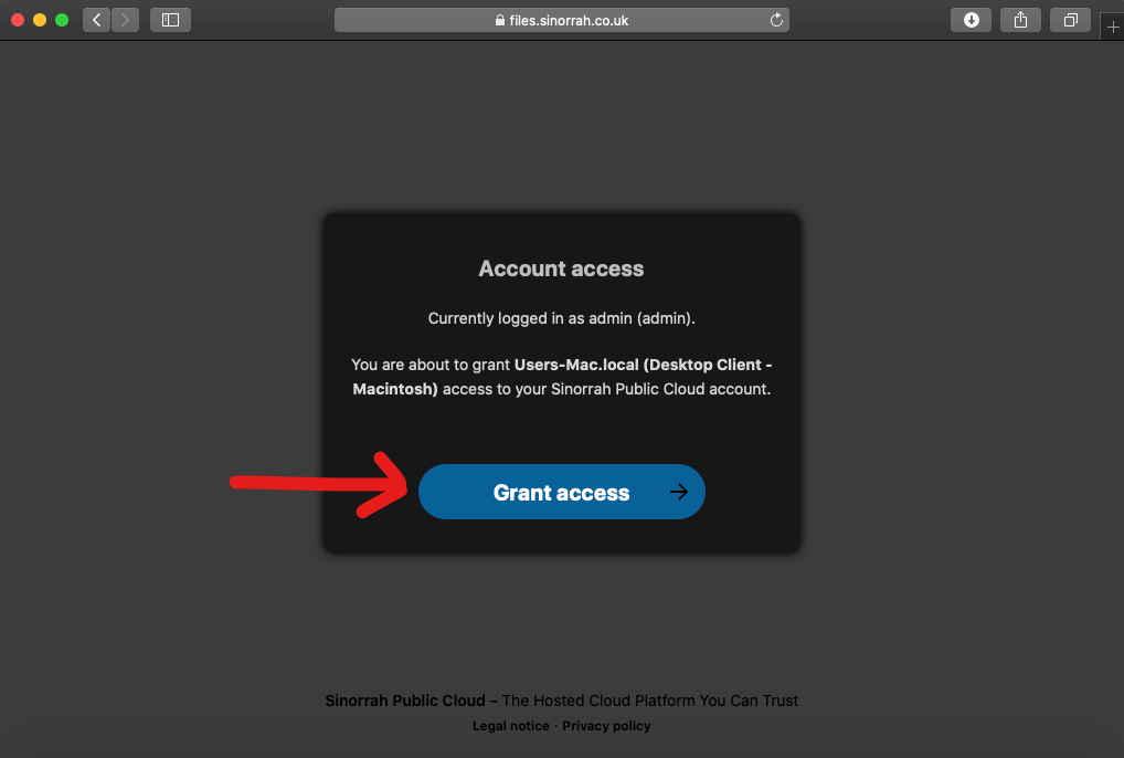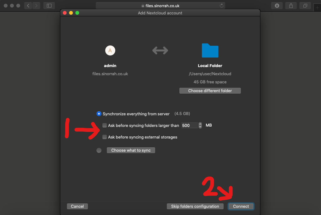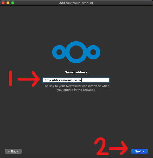 In the "Server address" box, type in "https://files.sinorrah.co.uk", then click "Next"