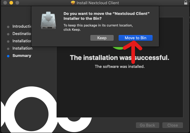 A pop up should appear asking if you would like to move the Nextcloud installer to the bin, click "Move to Bin"
