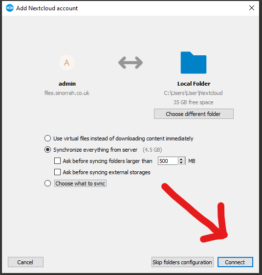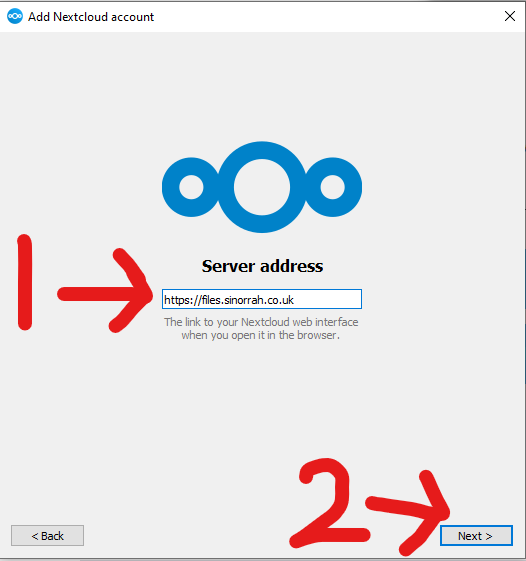 - Inside the "Server Address" box, enter "https://files.sinorrah.co.uk", then click next