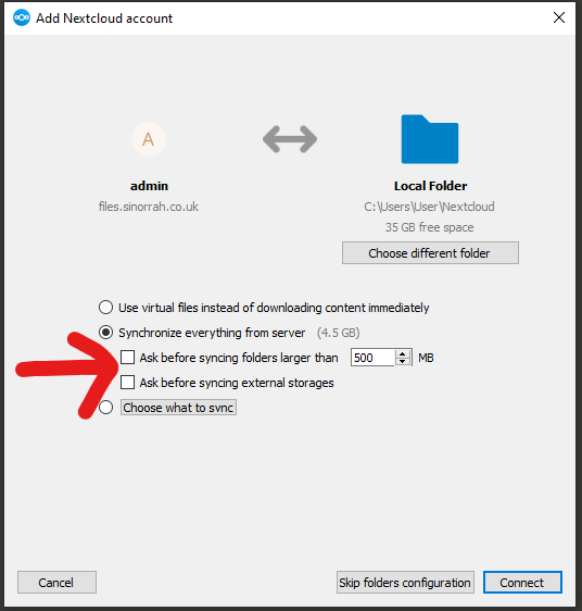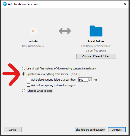If nextcloud does not pop back up, you should be able to open it from your task bar. - Select "Synchronize everything from server"