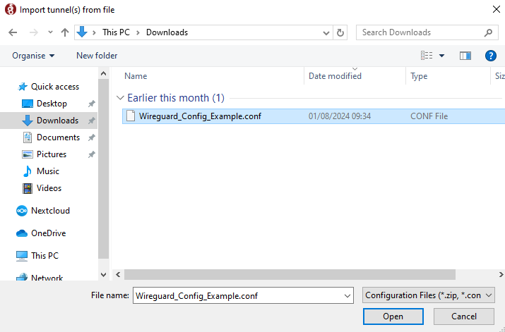 2. Download the WireGuard config file that has been sent to you, if you do not have it please contact us.